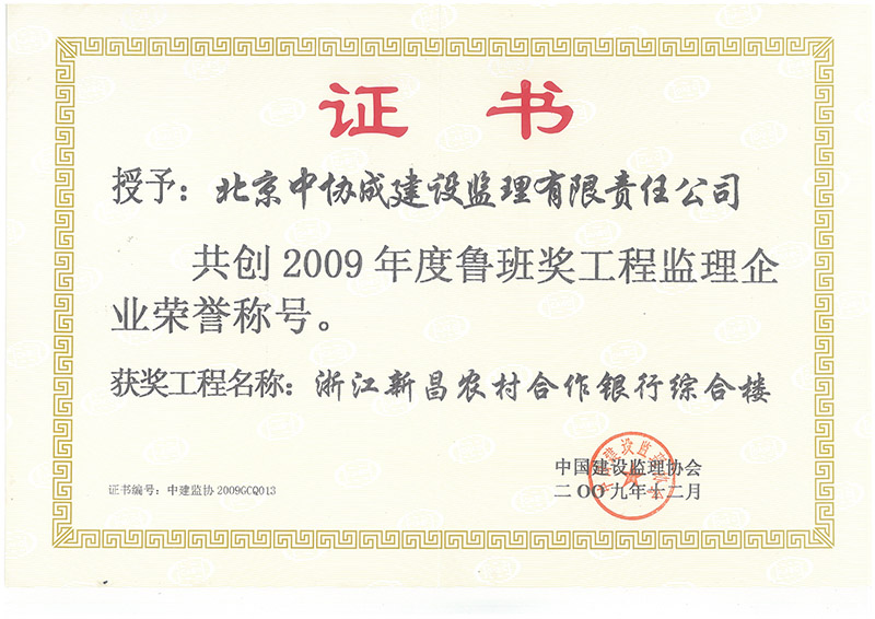 09年鲁班奖证书-浙江新昌农村合作银行综合楼