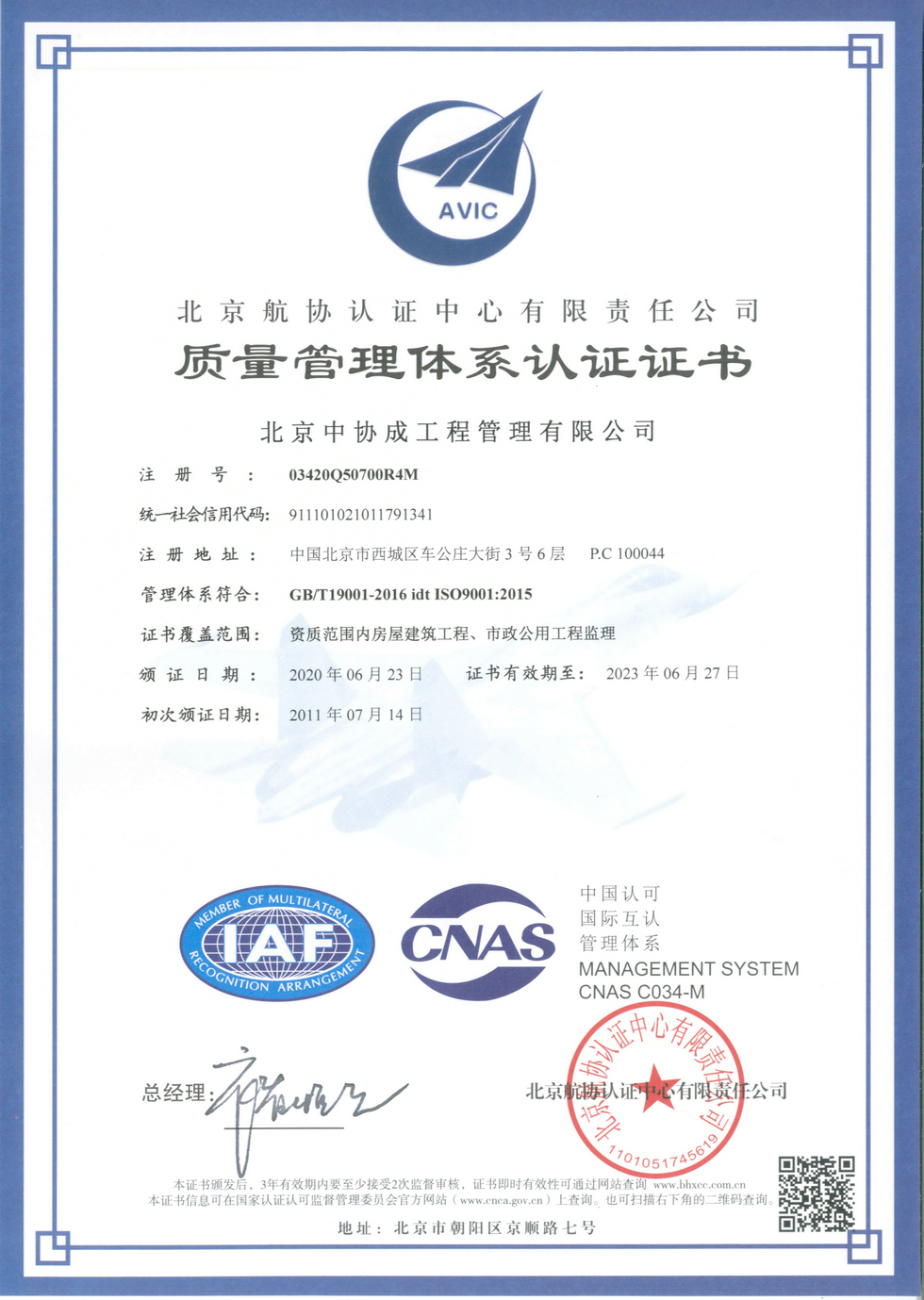 质量管理体系认证证书