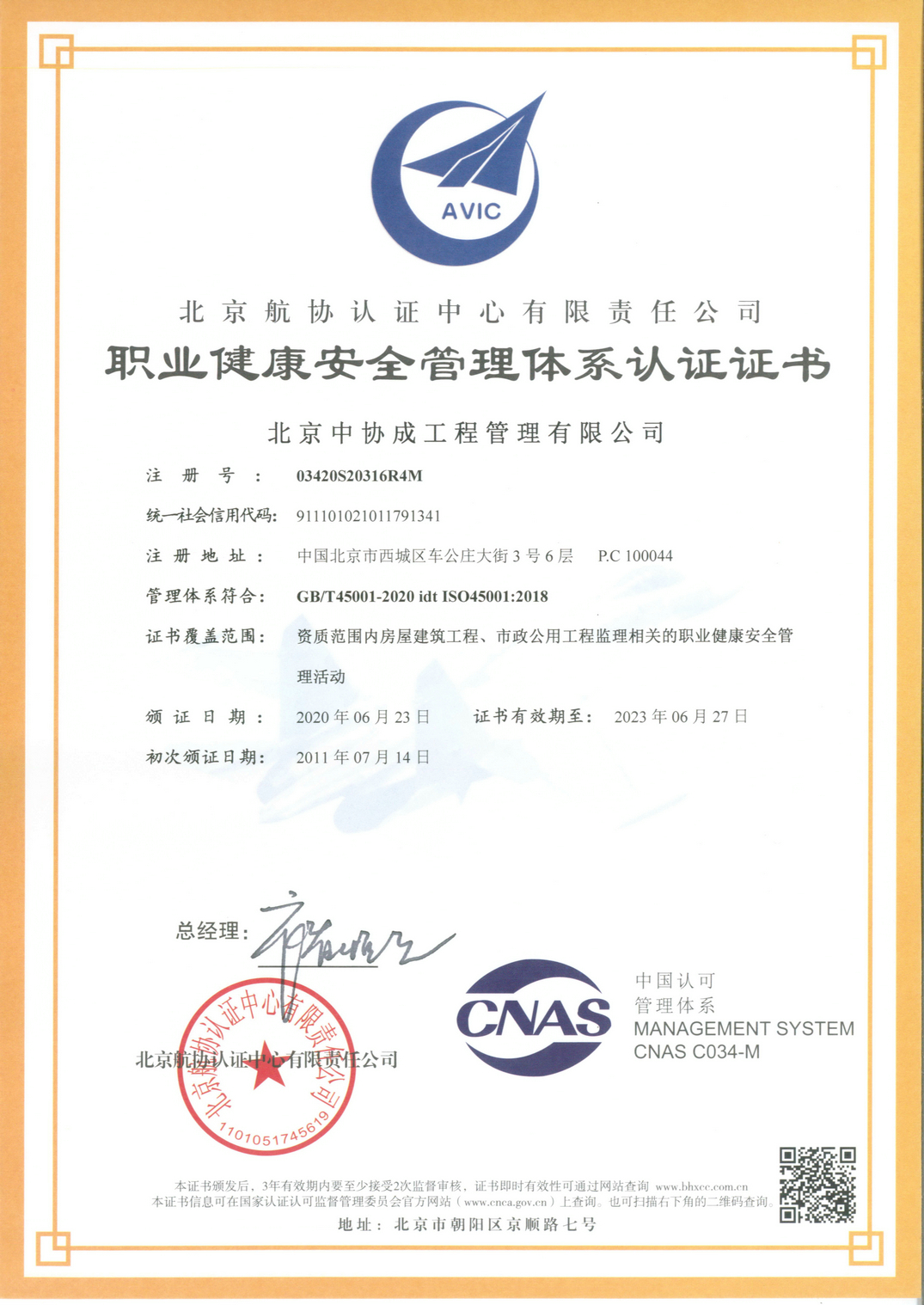 职业健康安全管理体系认证证书