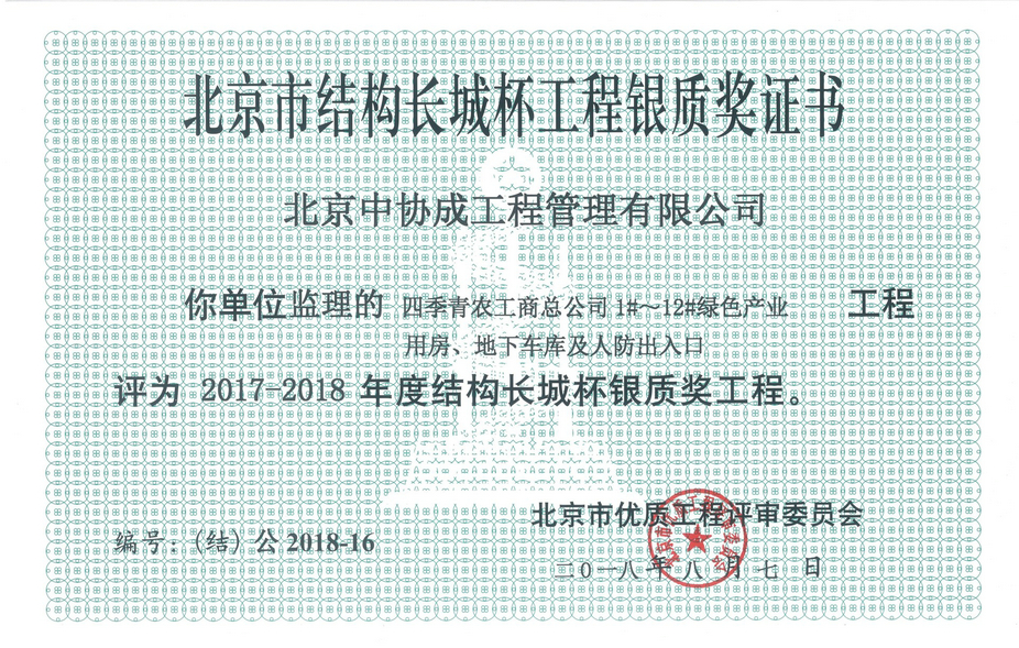 北京市结构长城杯工程银质奖证书